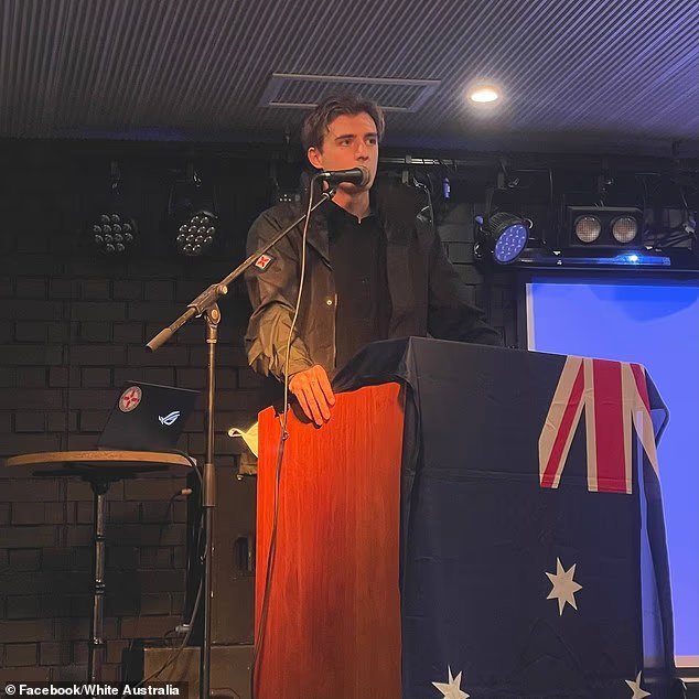 O líder do capítulo da Rede Nacional Socialista de Perth, Hagen Palme (foto), fala para cerca de 70 pessoas em um evento político no sábado à noite que foi fechado no local.