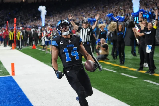 O ataque dos Leões tem sido ótimo durante a maior parte da temporada e começou bem na noite de segunda-feira. Detroit teve um drive de seis jogadas e 69 jardas que terminou com Goff encontrando Amon-Ra St. Brown no meio para um touchdown de 27 jardas e uma vantagem de 7-0.