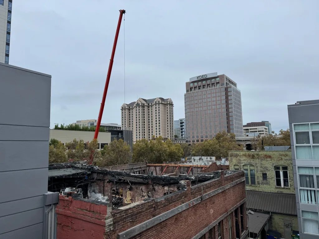 O edifício do Lawrence Hotel, localizado entre 69 e 89 East San Fernando Sts., entre a Segunda e a Terceira ruas, é agora o foco de um amplo esforço para remover detritos carbonizados do local, de acordo com o restaurateur de San Jose, Joseph Castillo, co-proprietário do edifício histórico.