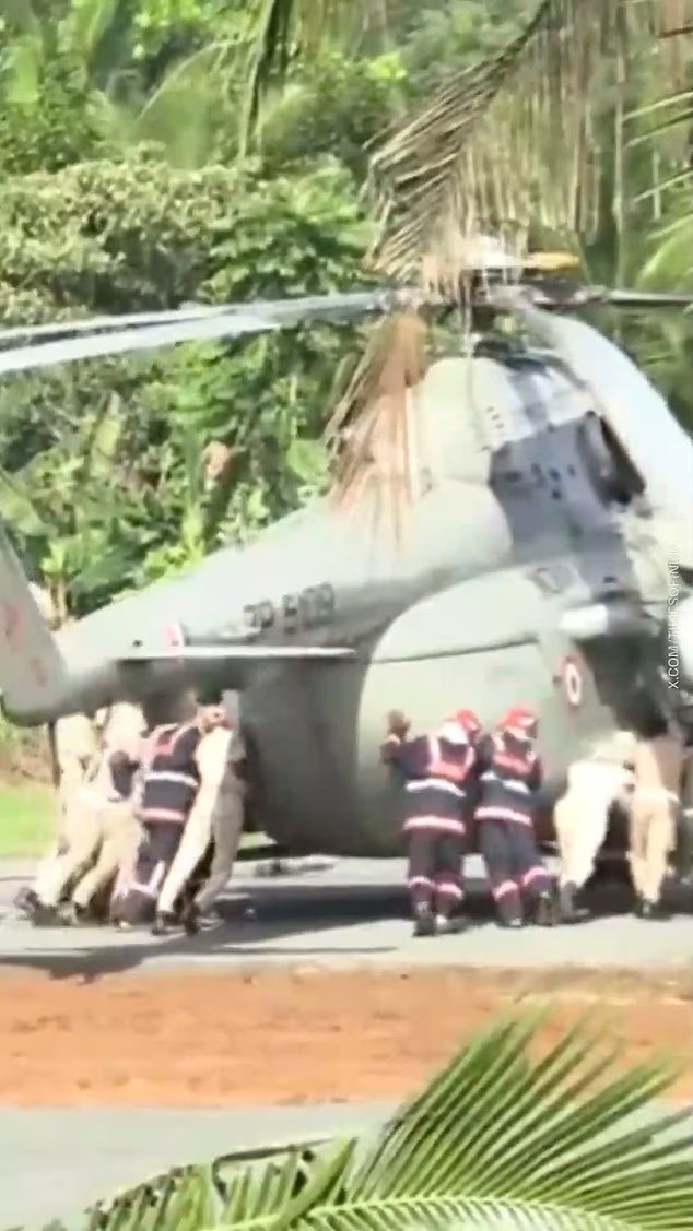 Os serviços de emergência correram para empurrar o helicóptero indiano depois que ele ficou preso no concreto recém-derramado.