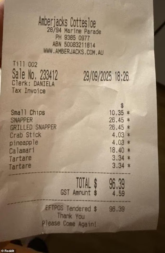 Um australiano decepcionado compartilhou uma foto de seu recibo (ilustrado) por US $ 100 peixes e chips comida