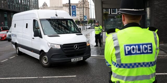 Acredita -se que a van de segurança esteja levando Paul Doyle que os magistrados do Liverpool chegaram a tribunal nesta manhã na presença da polícia pesada.