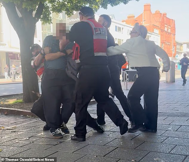 As imagens chocantes capturadas na Bar Street, em Southampton, mostraram que, no momento, as testemunhas disseram que ele foi jogado para o concreto depois de pular por trás.