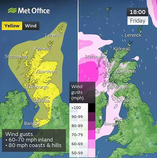 No entanto, ele acrescentou: ‘O sistema trará ar para as regiões norte e oeste, as rajadas atingiram extensivamente as áreas internas de 50 a 60mpg da Grã -Bretanha e atingiram 70 a 80 mph em alguns lugares, principalmente com costa aberta e fortes shakes nas colinas.