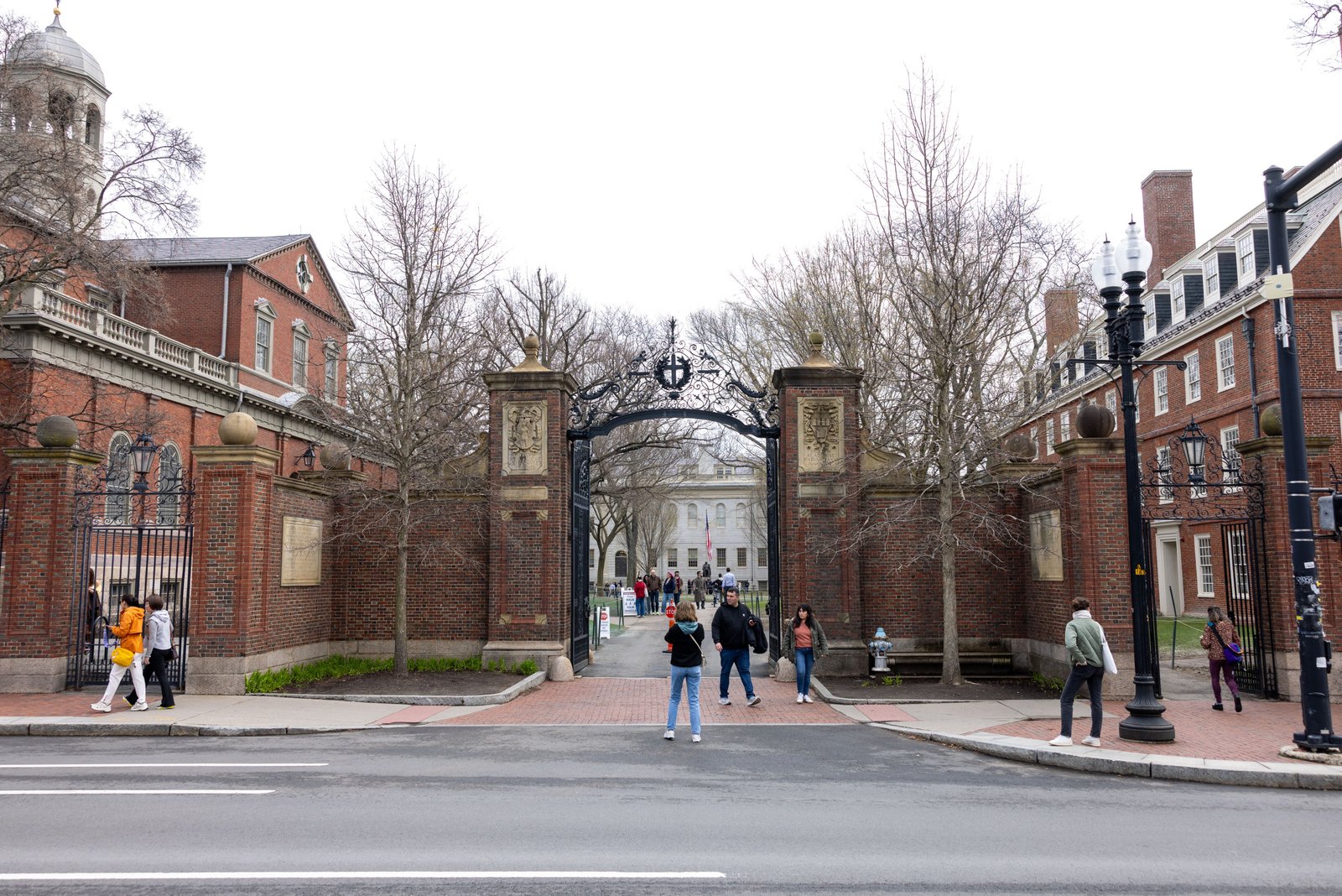Imagem de estoque: turistas em frente ao portão principal de Harvard Yard em 15 de abril de 2025 em Massachusetts.