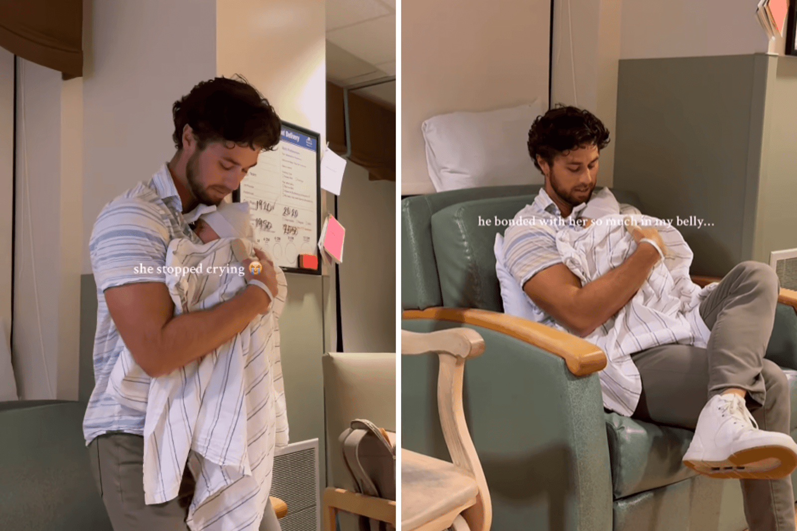O momento em que Parker foi entregue a seu pai Christopher, o recém -nascido – que gritou “Quando ele saiu do peito do balanço – ele imediatamente se acalmou. O texto da sobreposição afirma:” Meu marido costumava conversar com meu estômago sempre enquanto estava grávida “.