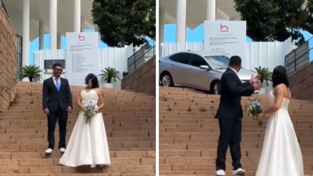 Sessão de fotos de casamento em acidente de carro na escadaria da catedral, assista ao vídeo