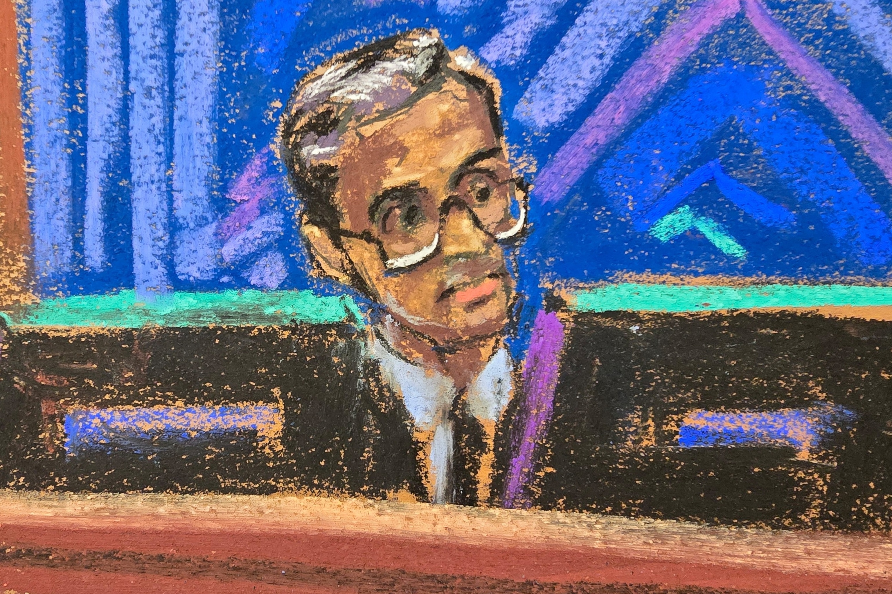 O juiz distrital Arun Subrahmanian esboçou a sala do tribunal em 30 de junho de 2025, as instruções legais de tráfico sexual de “DD” de Nova York para o júri durante o julgamento do tráfico sexual.