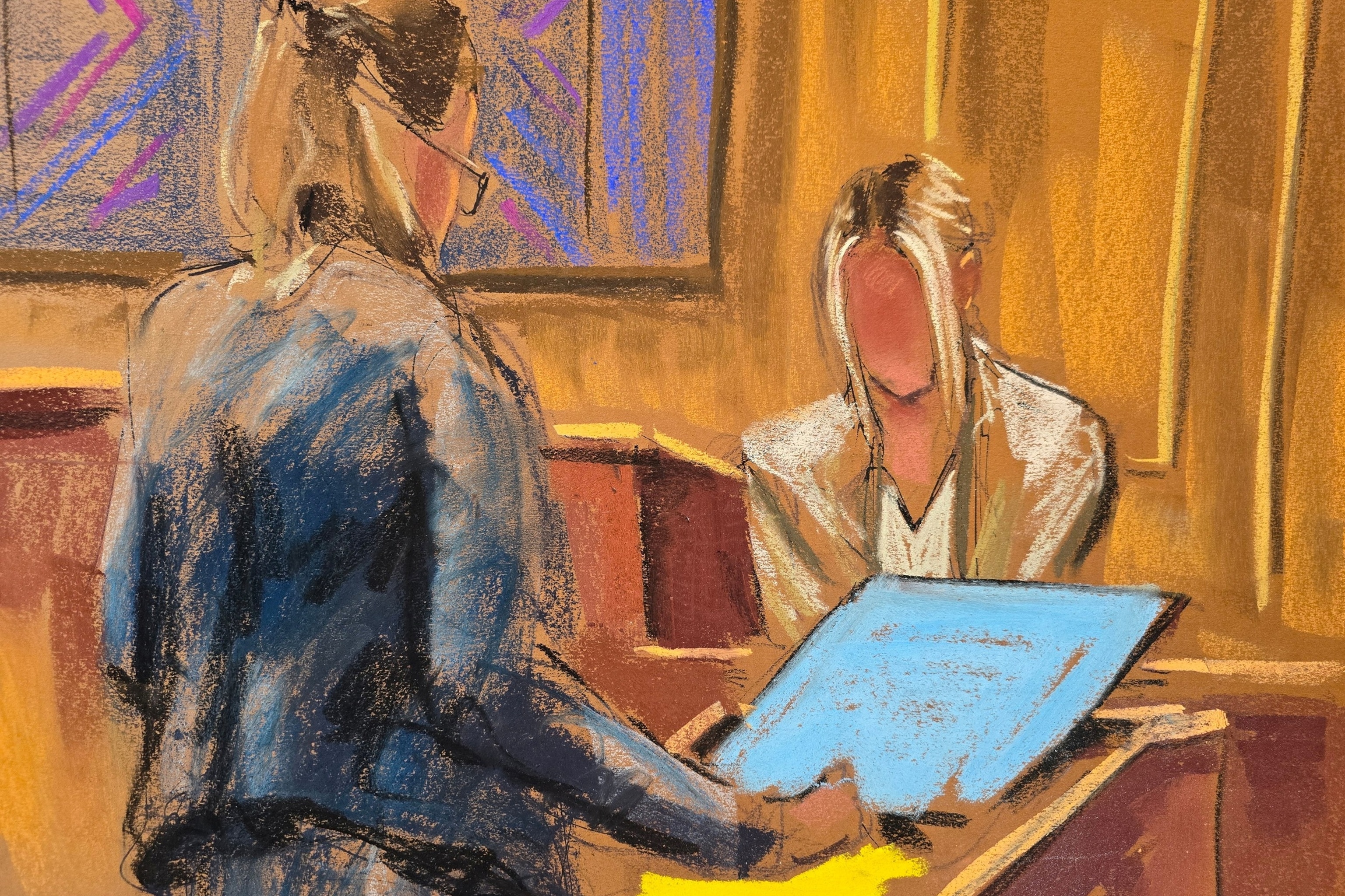 Advogado Anna Estava Cross Cassandra “Cassie” Venchura, enquanto Sean “DD” testou Nova York, em 16 de maio de 2025, no esboço deste tribunal durante o tráfico sexual de DD.