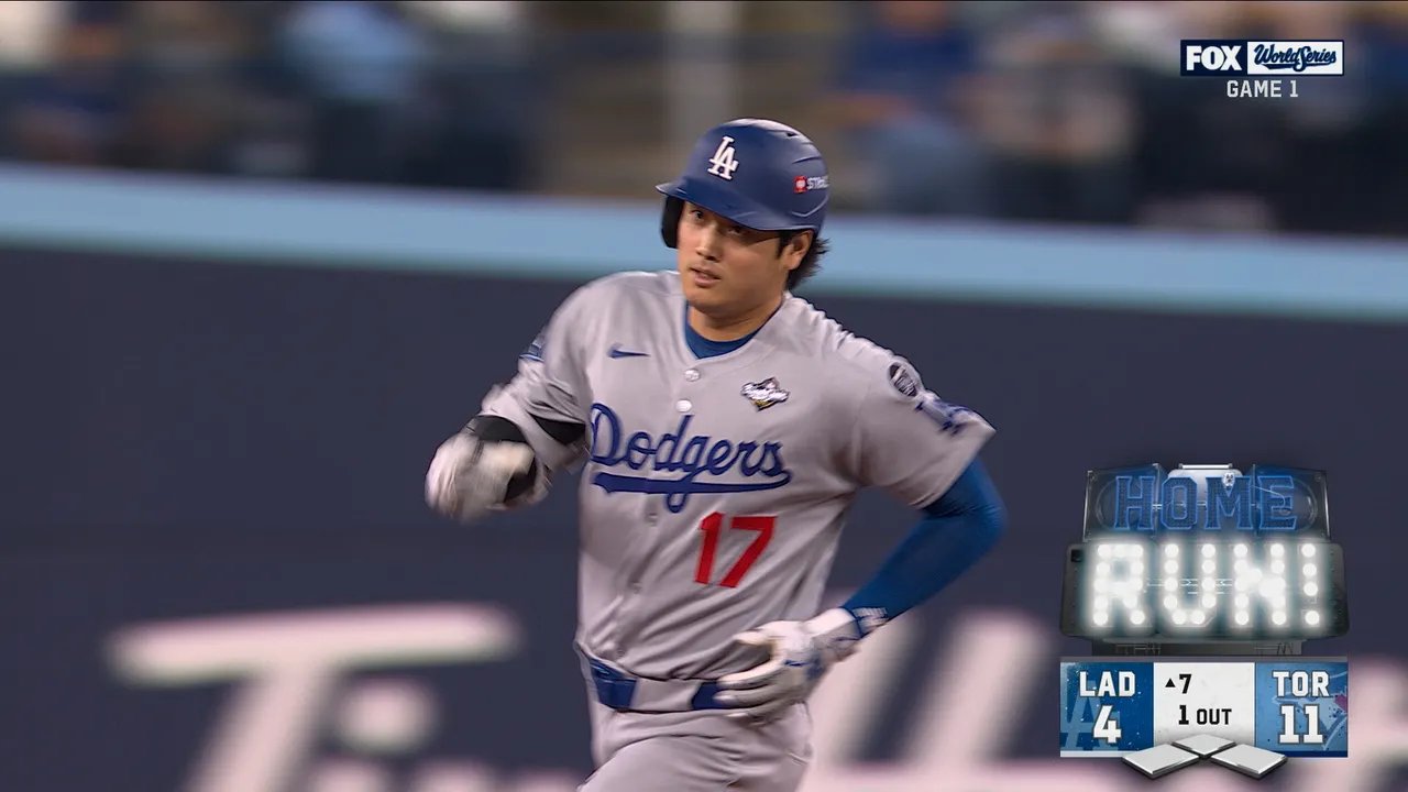 Shohei Ohtani, do Los Angeles Dodgers, faz um home run de duas corridas contra o Toronto Blue Jays na World Series.