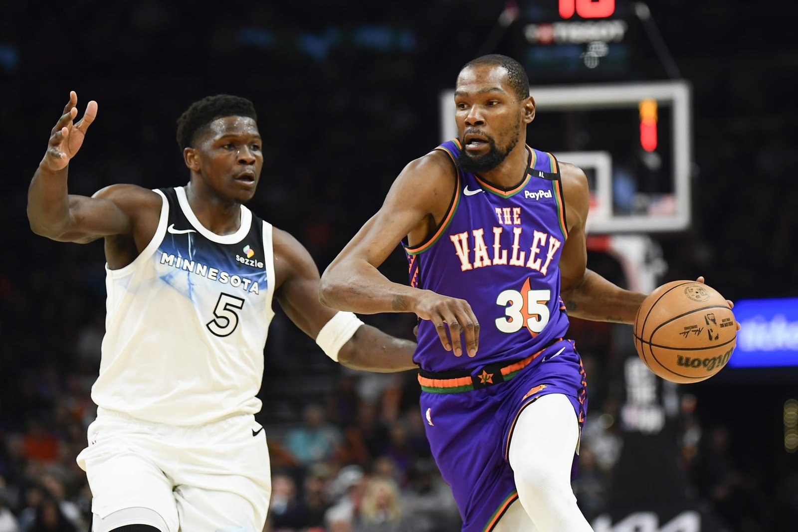 O Kevin Durant, do Phoenix Sunsse, #35, Antony Edwards, do Minnesota Timwallv, controla a bola contra o 5º lugar na arena PHX na primeira metade do jogo da NBA em 2 de março de 2025 em …