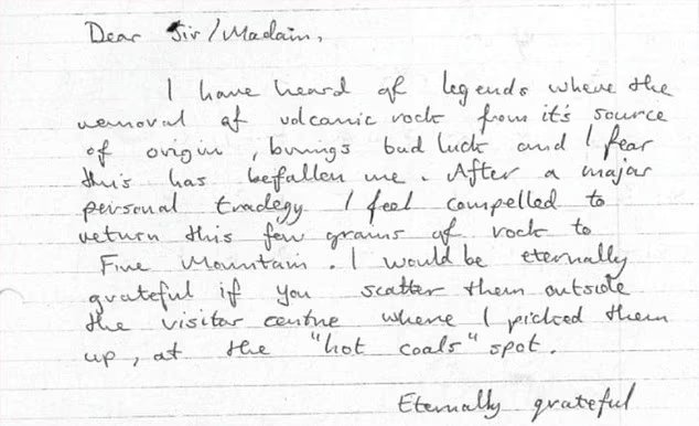 Numa carta manuscrita enviada ao parque nacional e recentemente divulgada pela organização, o turista explicou que, depois de sofrer «uma grave tragédia pessoal», sentiu-se obrigado a devolver as rochas vulcânicas.