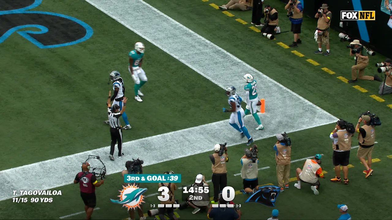 Tuwar Tagovailoa conseguiu Divon Achhan para um touchdown de 10 jardas para estender a liderança de Miami Dolphins no Carolina Panther’s.