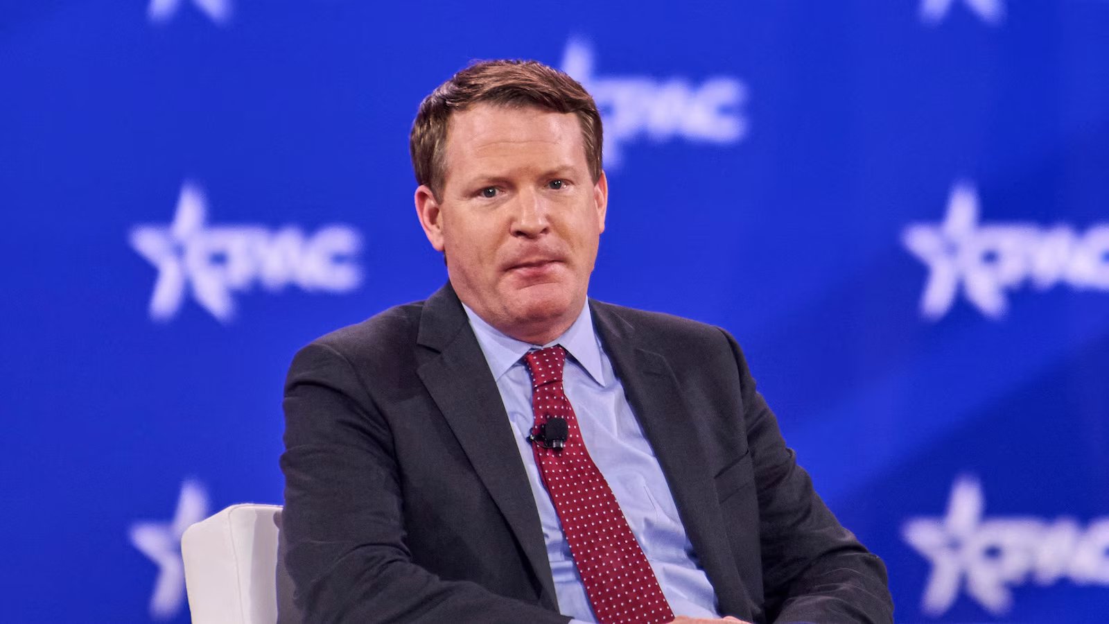 Mike Davis, da Sociedade Federalista, fala com o senador Eric Schmitt, republicano do Missouri, na conferência CPAC DC no Gaylord National Resort em Oxon Hill na quinta-feira, 20, 2025. (